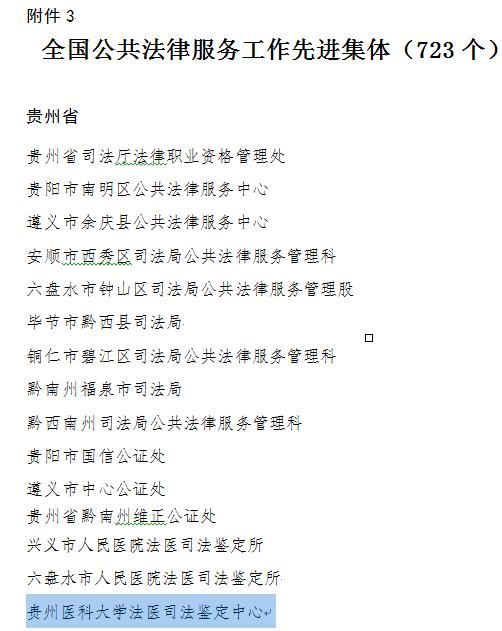 近日,国家司法部表彰了一批全国法律援助和公共法律服务先进集体和先进个人,其中全国法律援助工作先进集体共270个,全国法律援助工作先进个人424名,全国公共法律服务工作先进集体723个,全国公共法律服务工作先进个人名单964名。beat365法医司法鉴定中心在此次表彰中荣获“全国公共法律服务工作先进集体”称号。