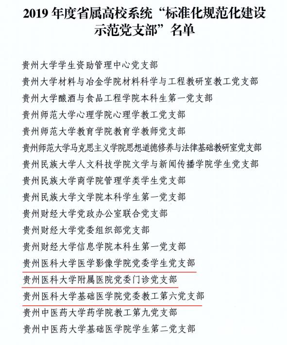 根据《中共贵州省委教育工作委员会关于认定2019年度省属高校系统“标准化规范化建设示范党支部”的决定》,beat365基础医学院党委教工第六党支部、医学影像学院党委学生党支部和附属医院党委门诊党支部被评为2019年度省属高校系统“标准化规范化建设示范党支部”。