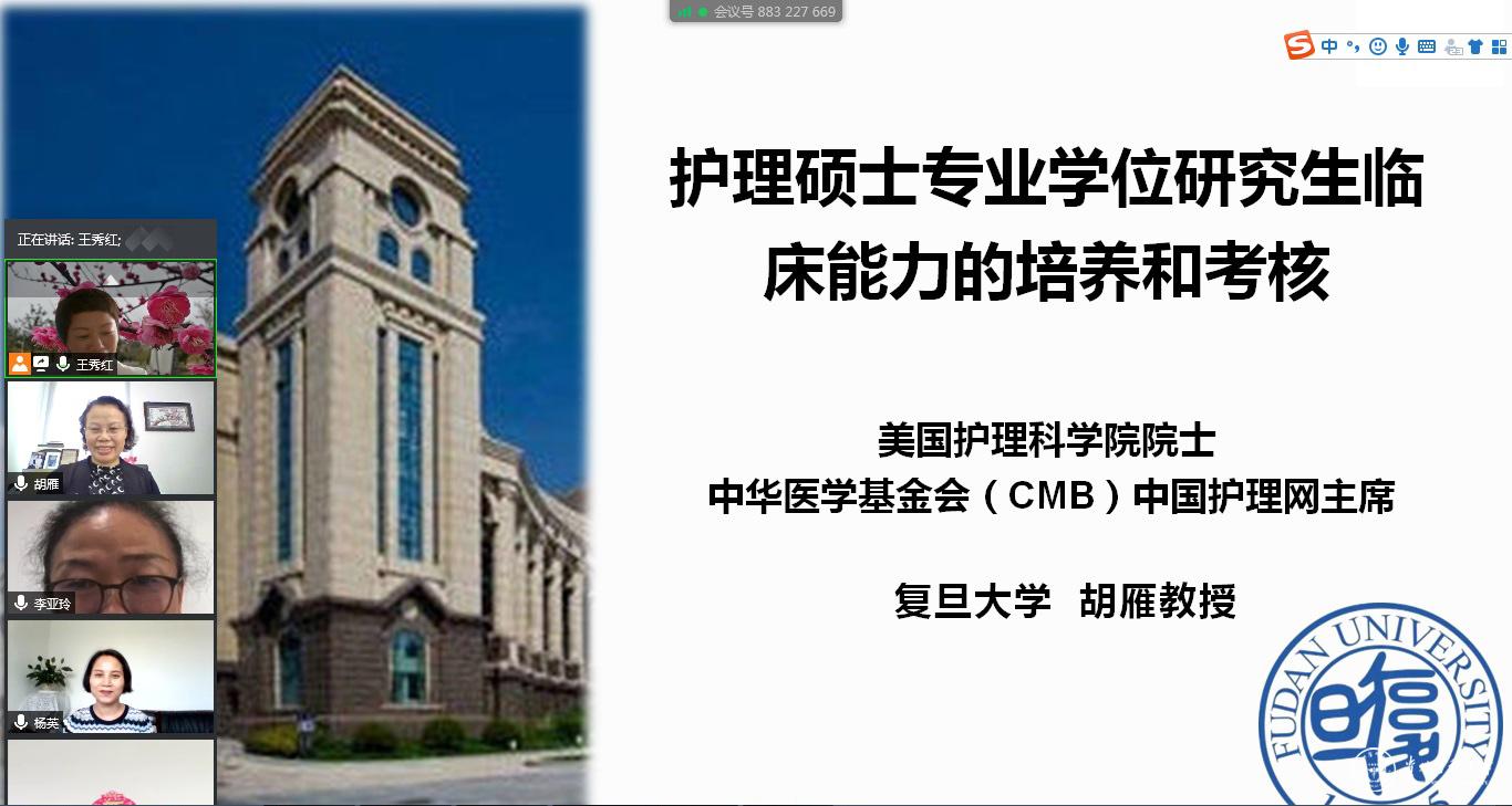 6月12日上午,复旦大学护理学院院长胡雁教授受邀为护理学院全体研究生导师和专业教师作题为《护理硕士专业学位研究生临床能力的培养及考核》专题讲座。会议通过腾讯会议平台进行,护理学院相关导师和教师近30人参加讲座,护理学院党委书记杨英主持。