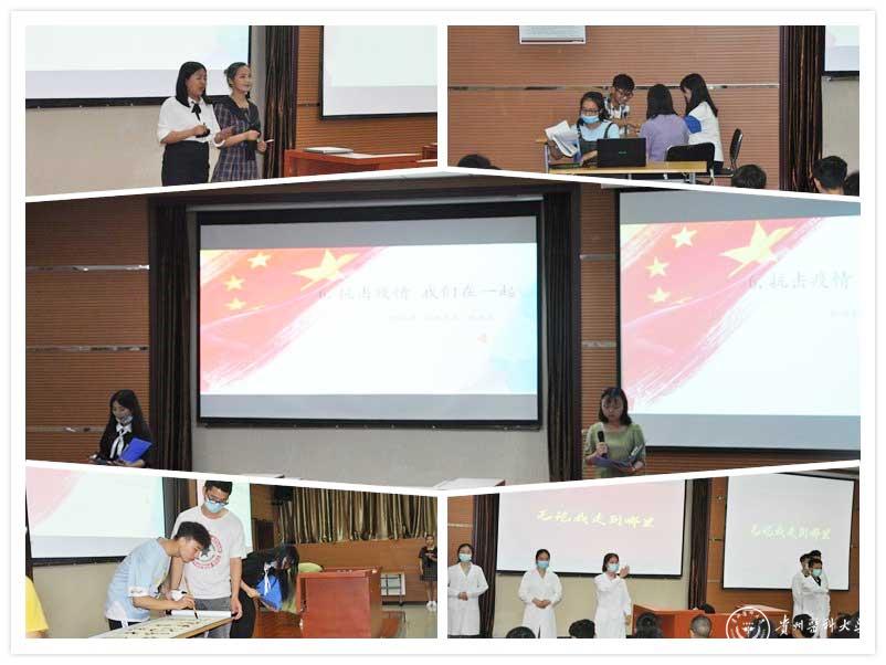 班会上,同学们还通过观看自制短视频“线上线下的日常”、舞台剧表演“同在一片天空下”、手语表演“我和我的祖国”、志愿者朗诵“抗击疫情我们在一起”、“现场毛笔书法”,表达了对所有为打赢疫情防控阻击战作出努力的工作者和志愿者的感谢,对学成之后投身公共卫生事业、守护人民健康的期待。
