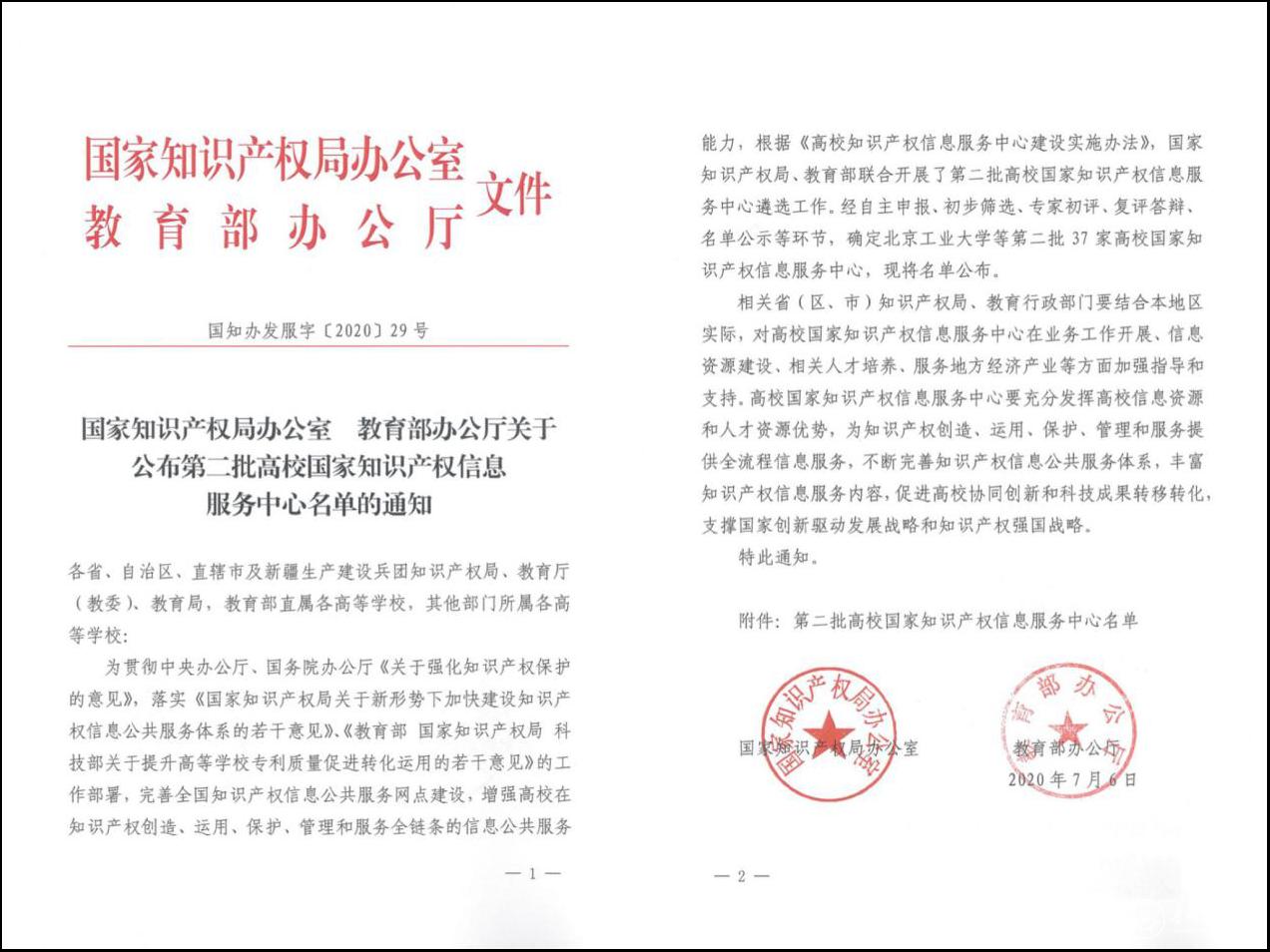 7月10日,《国家知识产权局办公室教育部办公厅关于公布第二批高校国家知识产权信息服务中心名单的通知》(国知办发服字〔2020〕29号)正式公布,beat365成功入选。