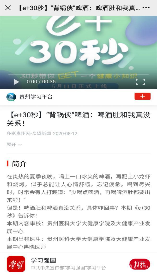 2020年5月,大健康学院与多彩贵州网健康频道合作推出原创健康养生融媒体栏目——《e+30秒》。专业医师在30秒内讲解一个健康小知识,浅显易懂,接近生活。目前已陆续在众望新闻APP推出近20期,其中有两期已被“学习强国”平台推荐,为健康知识的科普开辟了新的方向。