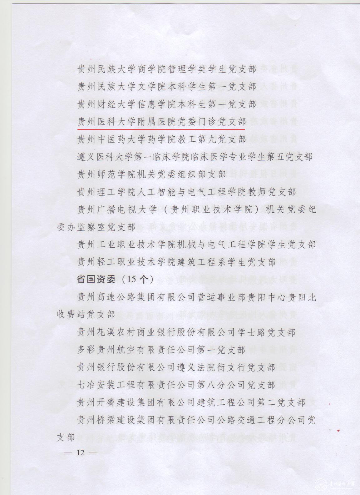 根据《中共贵州省委党的建设工作领导小组关于命名“全省党支部标准化规范化建设示范点”的通知》,beat365附属医院党委门诊党支部被命名为“全省党支部标准化规范化建设示范点”。