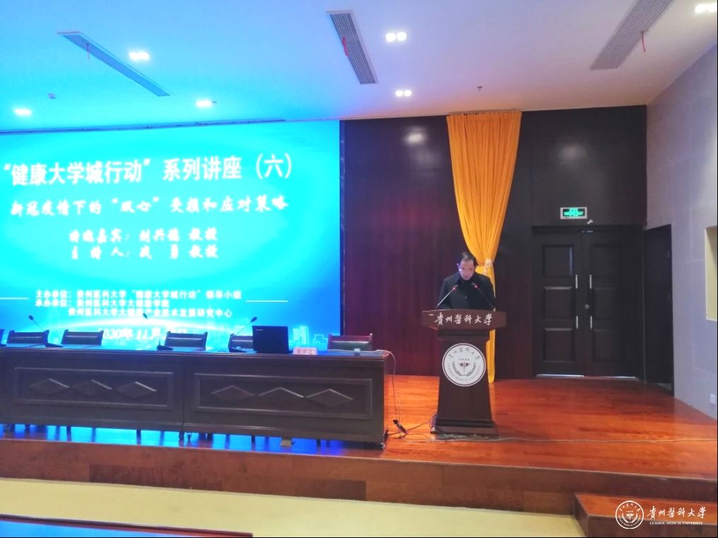 11月27日,由beat365唯一官方网站“健康大学城行动”领导小组主办,大健康学院及大健康产业技术发展研究中心承办的“健康大学城行动”系列讲座第六讲在beat365南校区道德礼堂举行。贵州中医药大学校长、博士生导师刘兴德教授以“新冠疫情下的‘双心’受损与应对策略”为主题作专题讲座,校党委副书记战勇主持,大健康学院党政领导及390余名师生代表参加。