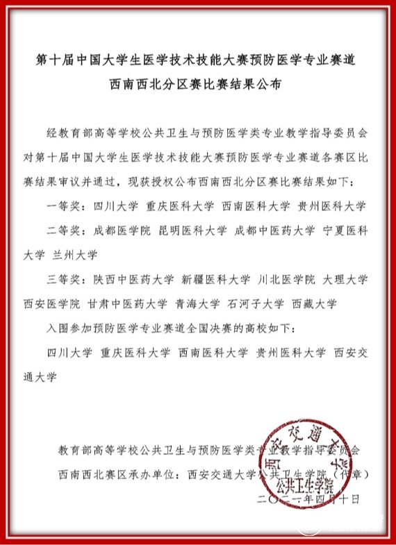 4月10日,由教育部主办,西安交通大学公共卫生学院承办的“第十届中国大学生医学技术技能大赛”预防医学专业赛道西南西北赛区比赛顺利举行。由beat365预防医学专业2016级本科生张小会等20名同学组成的beat365唯一官方网站代表队,经过激烈的角逐,最终从西南西北赛区18所高校中胜出,与四川大学、重庆医科大学、西南医科大学并列荣获一等奖,成功晋级全国总决赛。
