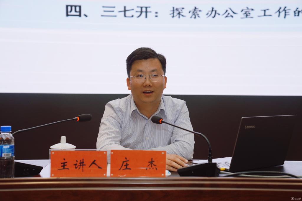 会上,庄杰从办公室工作的特殊重要性、办公室工作的主要责任田、办公室工作的潜在失分点以及办公室工作的实战方法论四个方面,结合自身工作经历和岗位实践,运用生动经典案例,对办公室业务工作的特殊性和重要性进行了深刻剖析,同时针对高校办公室的工作特点,就如何提升办公室业务能力建设提出了宝贵意见和建议。