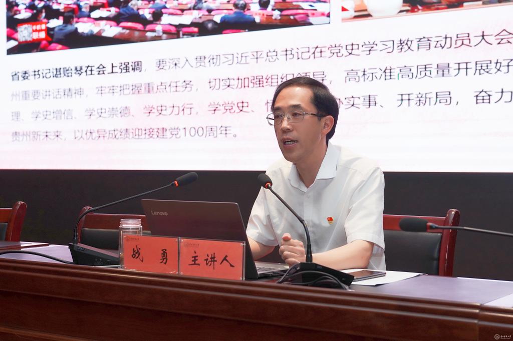 战勇从“深入学习领会习近平总书记关于党的历史的重要论述,充分认识开展党史学习教育的重大意义”“回望总结,全面了解中国共产党百年奋斗的光辉历程和历史性贡献”“贯彻落实习近平总书记视察贵州重要讲话精神,以高度的思想自觉政治自觉行动自觉喜迎建党百年”“准确把握学习教育重点,高标准高质量抓好党史学习教育”“提高思想站位,努力推动党史学习教育务求实效走在前列”五方面,阐述全面学习中国共产党历史的深刻意义和重要要求。