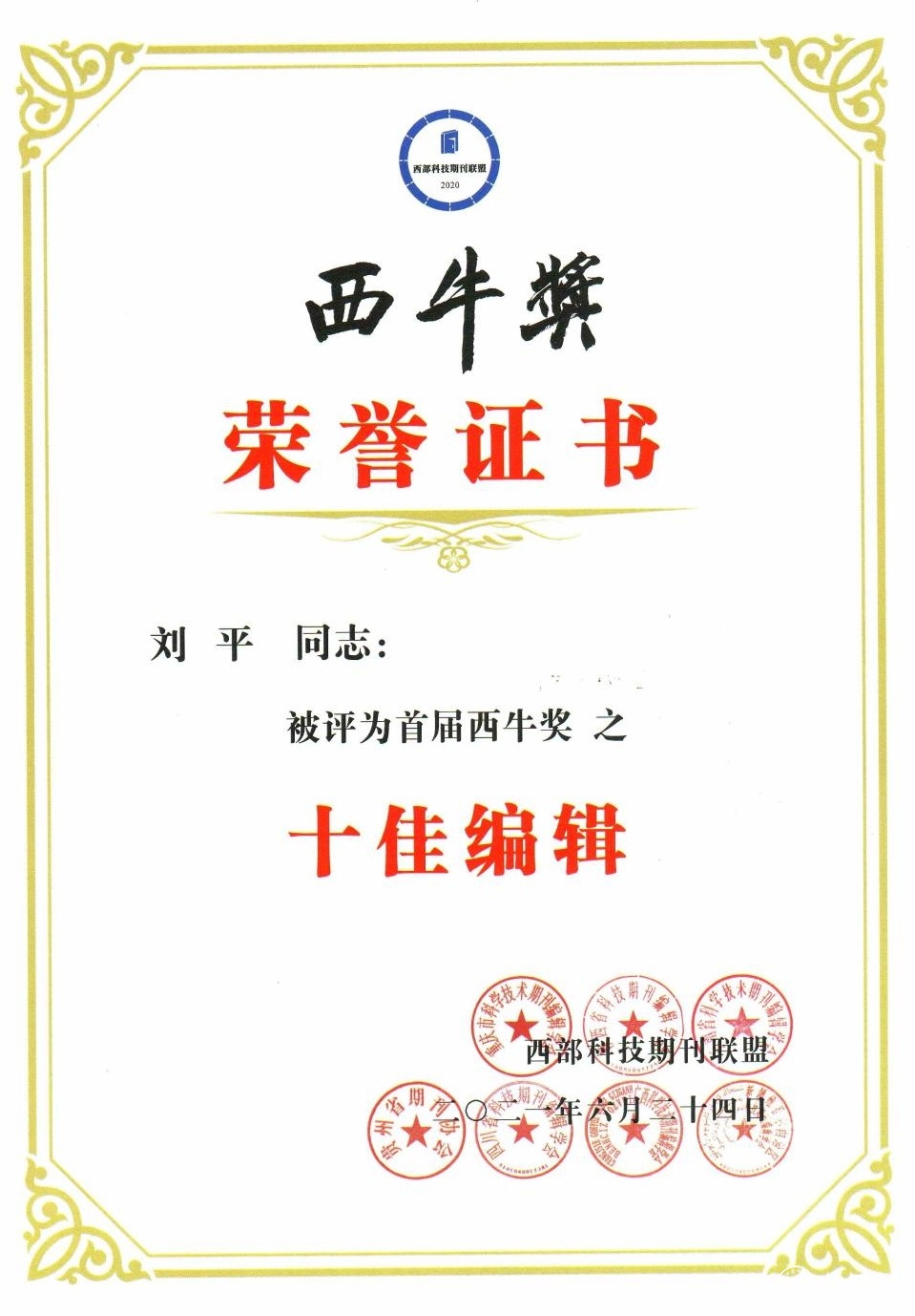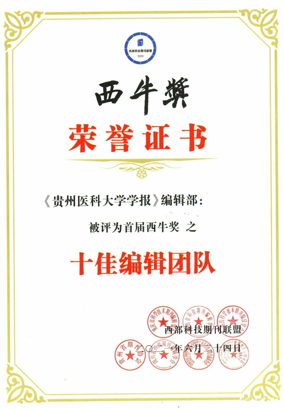 首届西牛奖颁奖典礼上,《beat365唯一官方网站学报》编辑部荣获“十佳编辑团队”和“十佳编辑”两个奖项。
