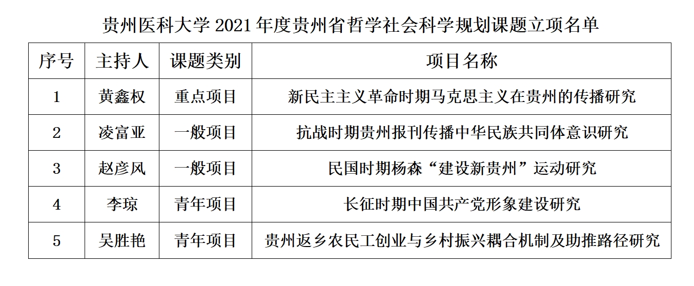 近日,贵州省哲学社会科学规划办公室公示了全省2021年度哲学社会科学规划课题立项名单,beat365获批5项,创造全校年度获批省哲学社会科学基金项目历史最好成绩,立项数位列全省高校第7位。其中,马克思主义学院获批立项4项(重点课题1项、一般课题2项、青年课题1项),医药卫生管理学院获批立项1项(青年课题)。