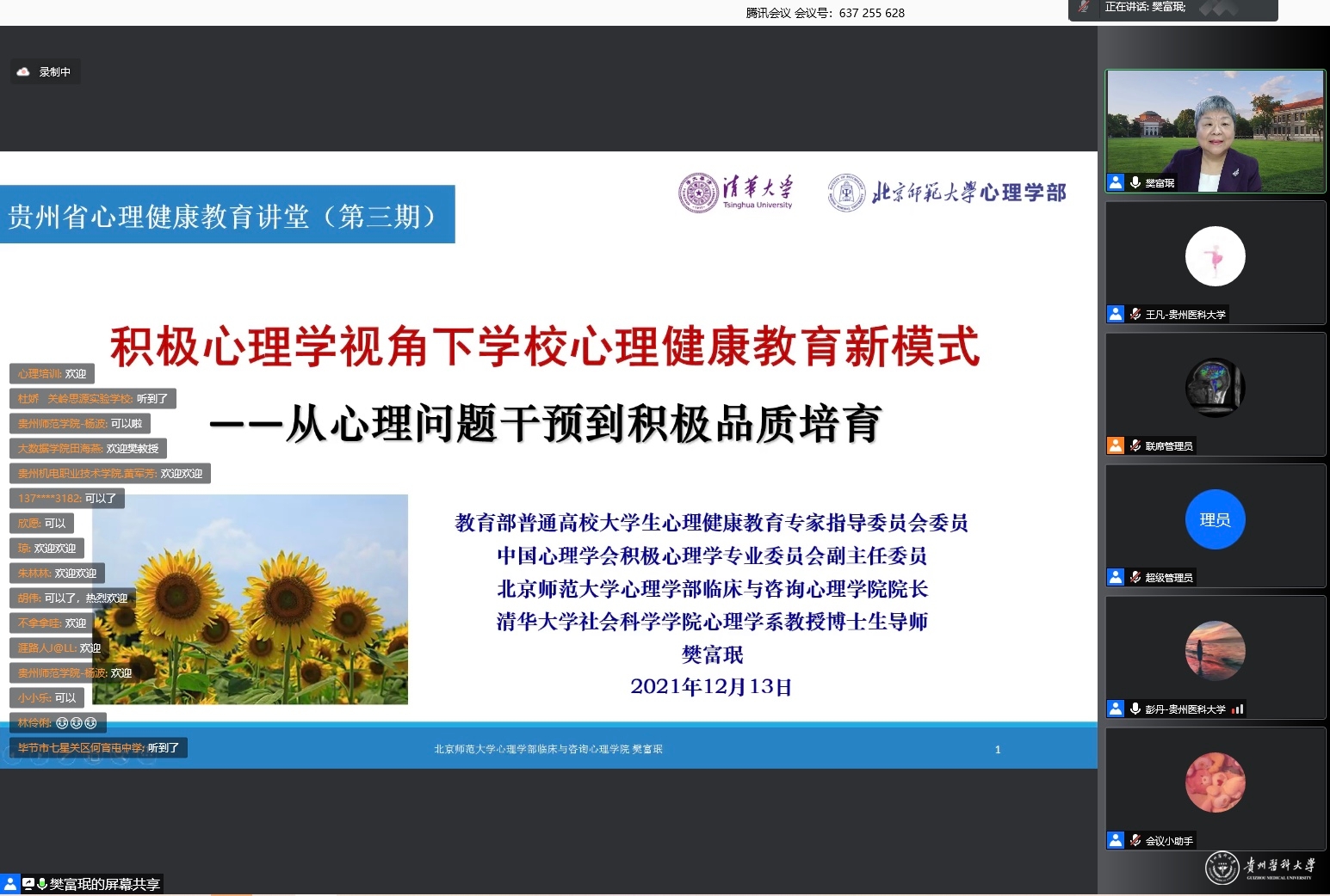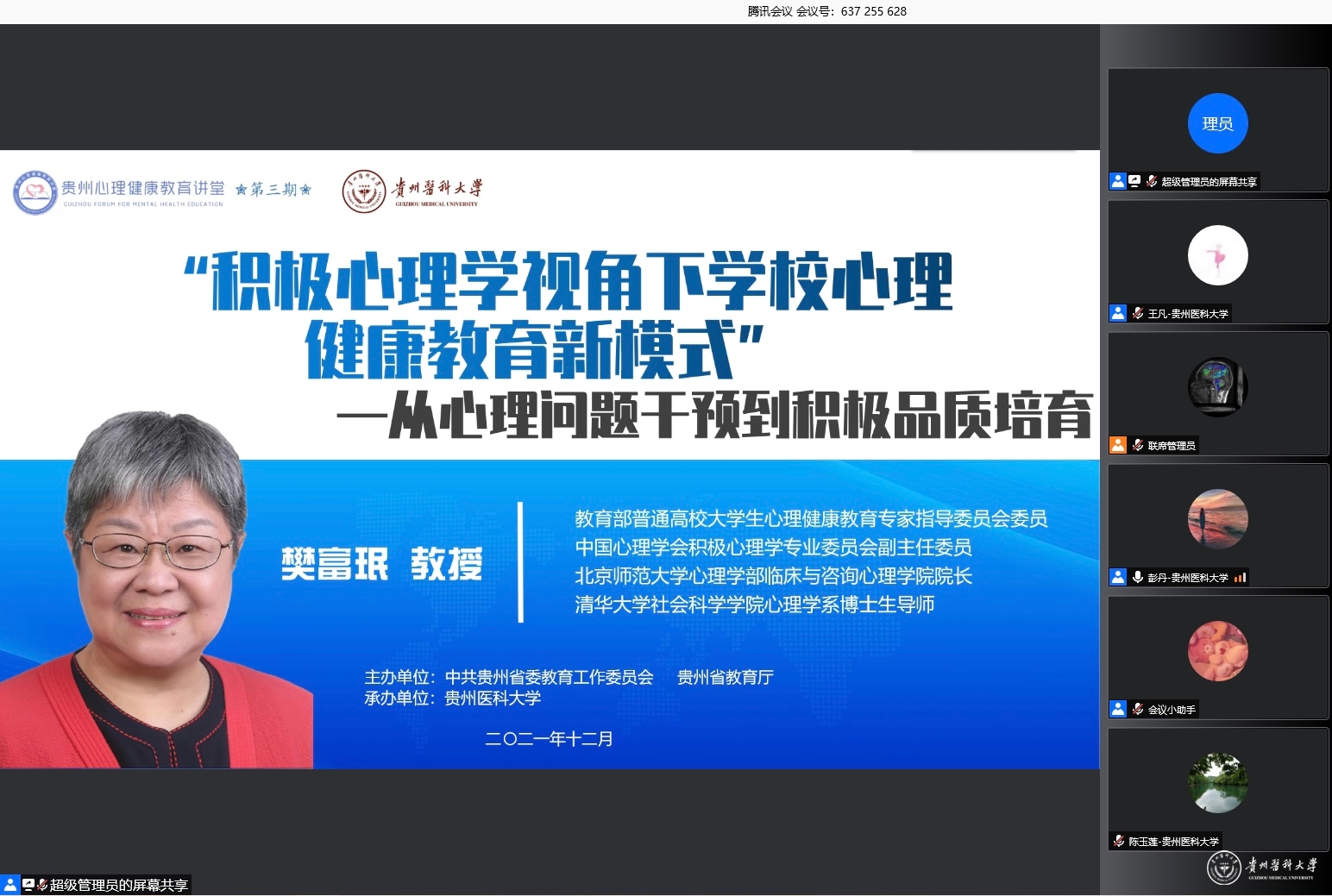 12月13日,第三期贵州心理健康教育讲堂在线举行。本期讲座由省委教育工委、省教育厅主办,beat365唯一官方网站承办。省委教育工委副书记(正厅级)、教育厅党组成员杨未出席并讲话,beat365党委副书记汤磊出席并致辞,全国知名心理专家樊富珉教授为全省2000余名大中小学心理健康教育教师、高校辅导员、中小学班主任、心理健康教育工作管理人员做专题讲座。大学生心理咨询与教育中心副主任彭丹主持讲座。