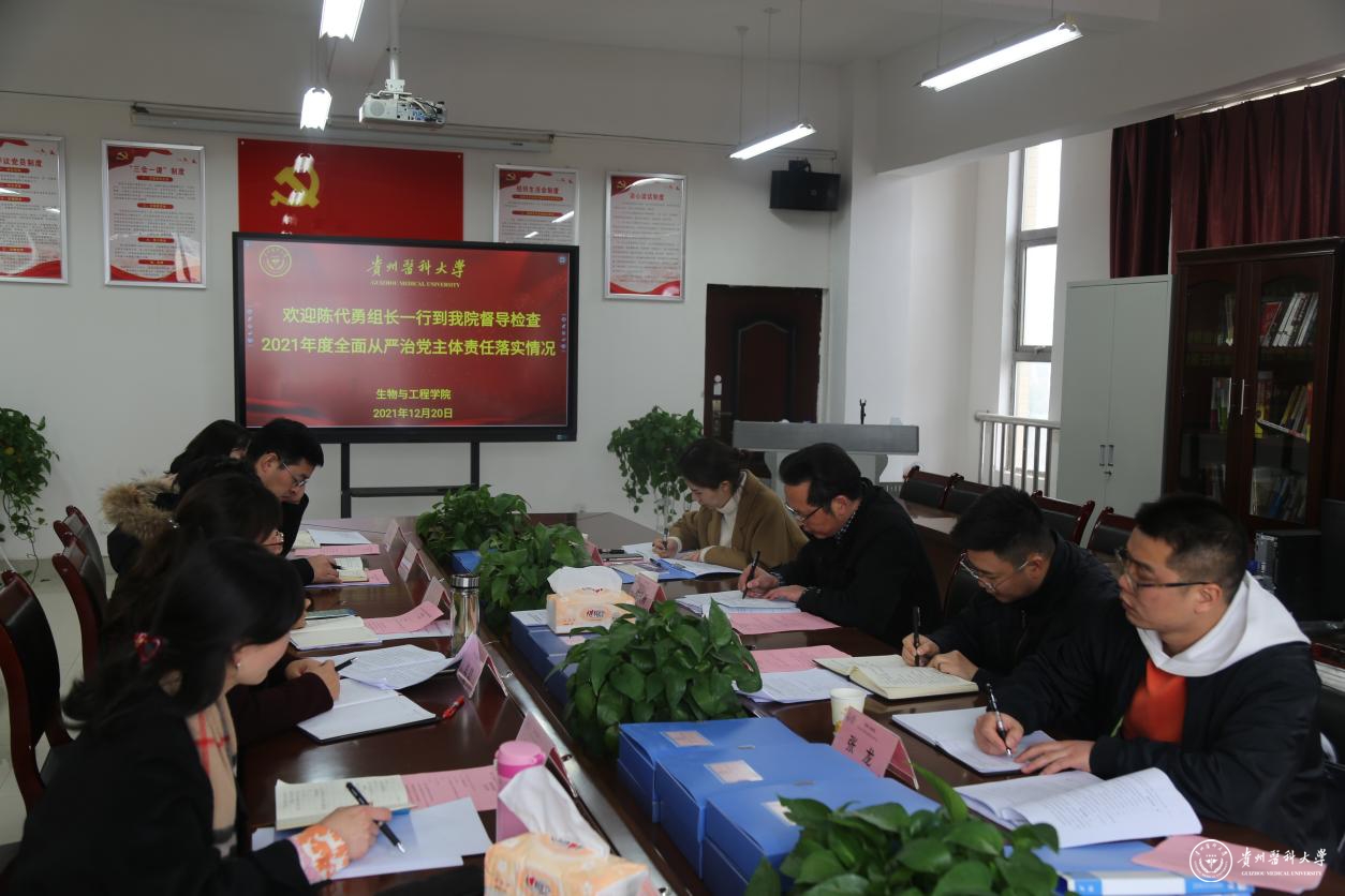 12月20日,生物与工程学院在厚德楼五楼会议室开展2021年全面从严治党主体责任落实情况督导检查,省纪委、省监委派驻beat365唯一官方网站纪检监察组组长、学校党委巡查工作领导小组成员、第八检查组组长陈代勇,副组长陆法钢、姚琨,联络员张龙,生物与工程学院党委班子成员,学院各支部书记参加,院长刘红美主持会议。