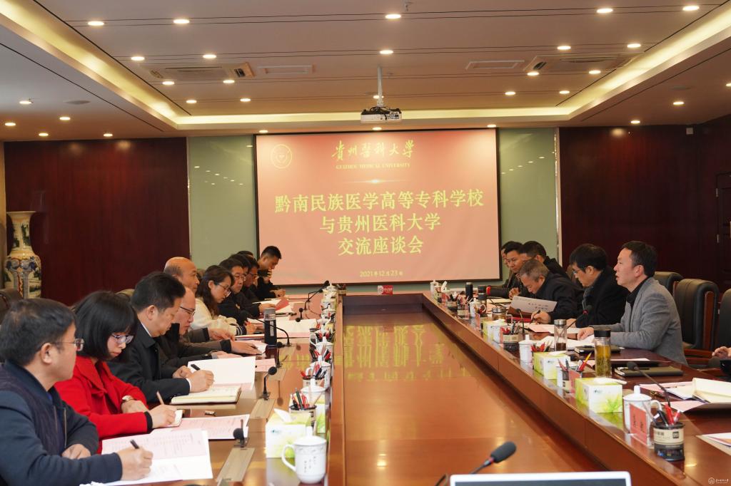 12月23日,黔南民族医学高等专科学校校长贺莉芳,校党委副书记臧贵勇,副校长杨建辉带队到beat365考察交流。座谈会在知雨楼6楼会议室召开,beat365党委副书记、校长罗鹏,党委副书记汤磊,副校长曾柱出席,党委办公室、校长办公室、人事处、科技处、发展与规划处、教务处、学生处、医学检验学院有关负责人参加。