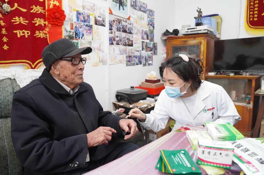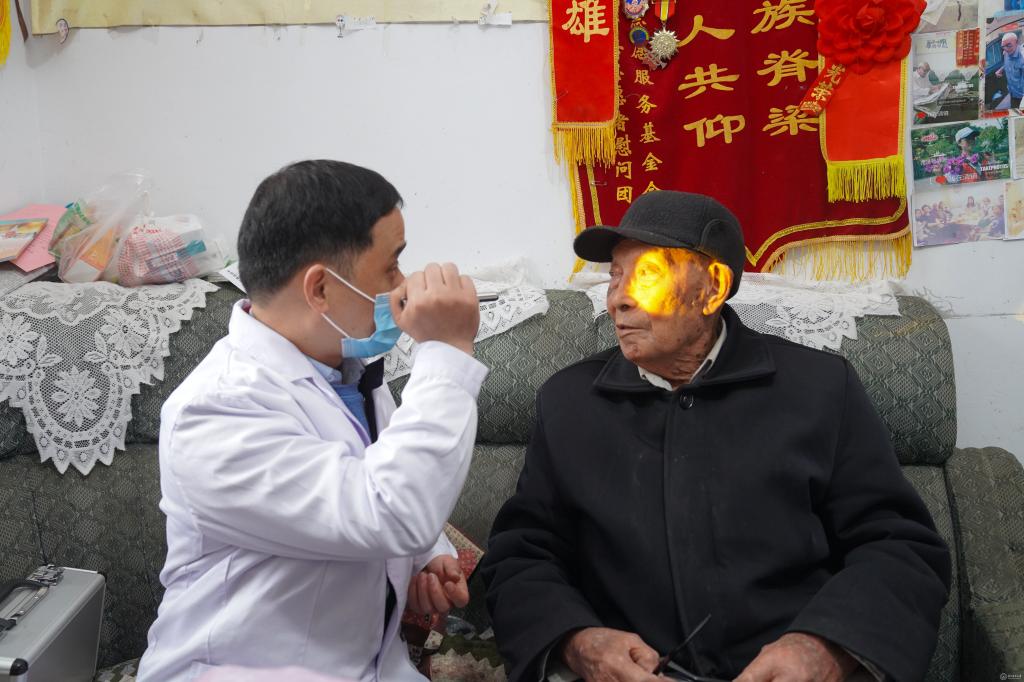 在义诊过程中,眼科与皮肤科的专家了解到小区有位109岁高龄的独居老人常年受眼疾与皮肤疾病困扰,步行穿过几个街区到老人家中进行诊疗。老人原是参加过抗日战争的老战士、老英雄,所患疾病亦是当年在战场上受伤所致。两位专家仔细为老人诊治后,赠送相应的药品,向照顾老人的志愿者给出了用药建议及日常照顾时需要注意的事项。老人对专家们的到来表示感谢,向所有人双手竖起了大拇指。