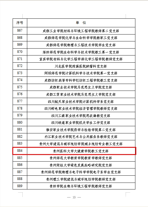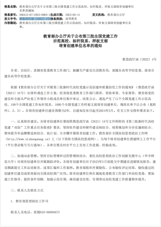 根据《教育部办公厅关于公布第三批全国党建工作示范高校、标杆院系、样板支部培育创建单位名单的通知》,大健康学院教工党支部入选第三批全国党建工作样板支部培育创建单位。