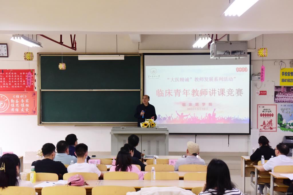 5月10日,临床医学院在4401教室开展2022年度青年教师讲课竞赛。校党委委员、附属医院党委书记、临床医学院党委书记李海洋,教务处处长温小军,党委教师工作部(教师工作处)处长徐国强,附属医院副院长、临床医学院副院长楚兰及临床医学院领导班子成员出席比赛。教务处副处长修江帆,临床医学院副院长戚璐,基础医学院生物学系主任杨明,影像学院影像诊断教研室副主任阮志兵,基础医学院病理生理学教研室杨婷老师以及“协和班”同学代表担任评委。此次竞赛共有内科学、外科学、妇产科学、病理学等15个教研室共15位教师参赛。临床医学院各教研室主任及教师代表到场观赛。