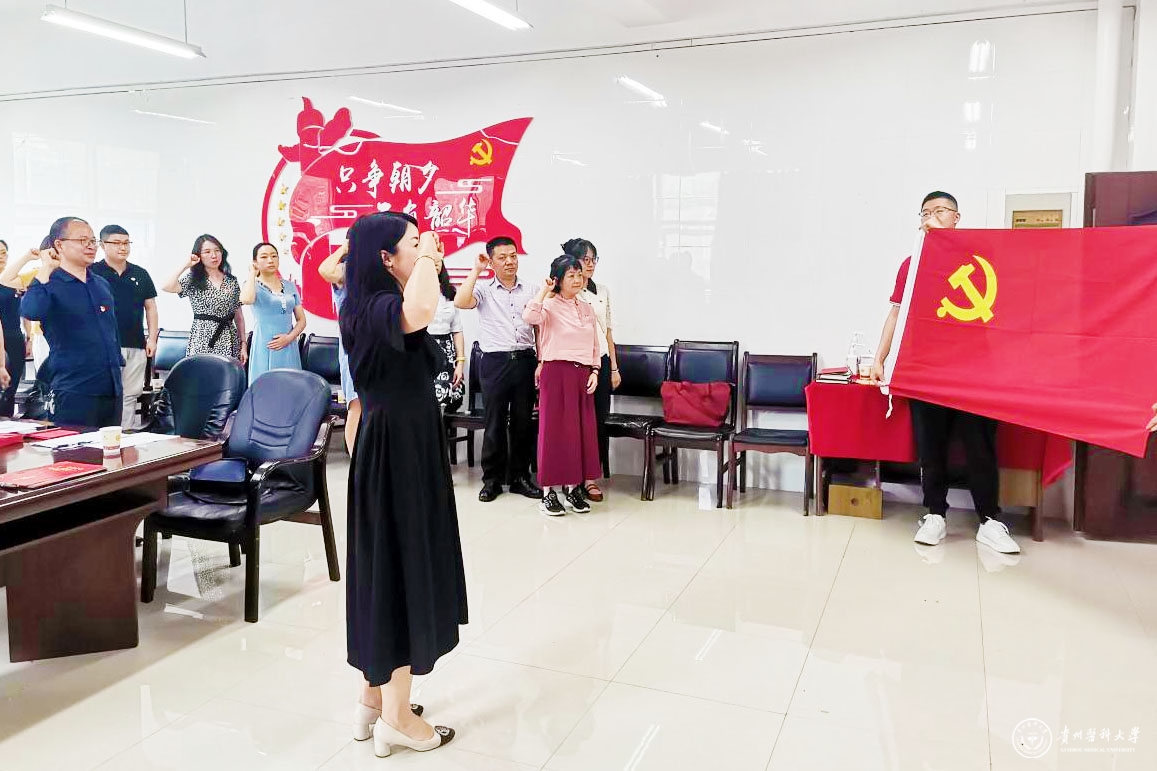 基础医学院党委书记王妤煜带领全体参会人员重温入党誓词。在庄严的党旗下,铿锵有力的宣誓声中,大家重温初心、重悟信念,坚定了党员的责任、使命、荣耀。