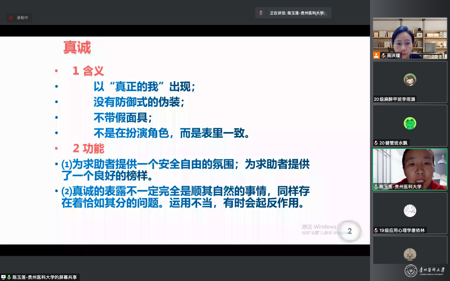 培训结合当下的疫情防控形势,以及培训对象的实际工作进行。针对不同对象,分别围绕“疫情防控期如何做好学生心理辅导”“危机识别与干预方法”“疫情防控期辅导员自我关照”“疫情防控期大学生常见心理反应及应对策略”“朋辈心理疏导与支持技巧”五个主题开展,培训内容包含理论知识和具体操作技术,用浅显易懂的方式普及心理健康专业知识,对培训对象做好日常的学生心理辅导工作,具有一定的指导性和可操作性。