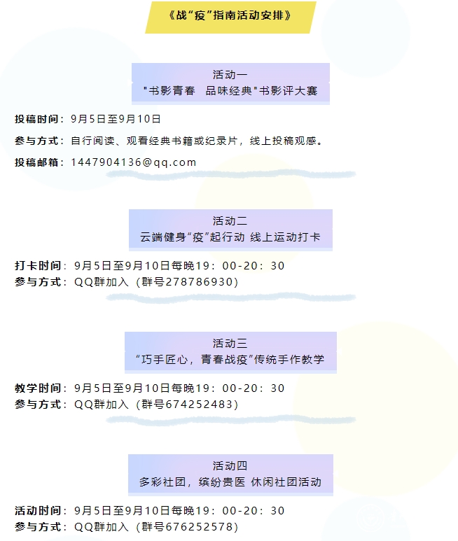 开展线上文体活动。学校组织丰富的“云”文体活动,缓解师生在学校实施静默管理状态下的负面情绪。“书影青春 品味经典”书影评大赛;云端健身“疫”起行动,线上运动打卡;“巧手匠心 青春战疫”传统手作教学;多彩社团 缤纷贵医休闲社团活动;“抗疫有我·黔青向党”手势操接龙、“抗疫有我·青春喊话”快闪接龙、“抗疫有我·微笑传递”活动接龙等系列战“疫”活动,受到学生的广泛好评。线上心理指导与文体活动的全面展开,对培养学生理性平和的健康心态起到了科学支撑作用。
