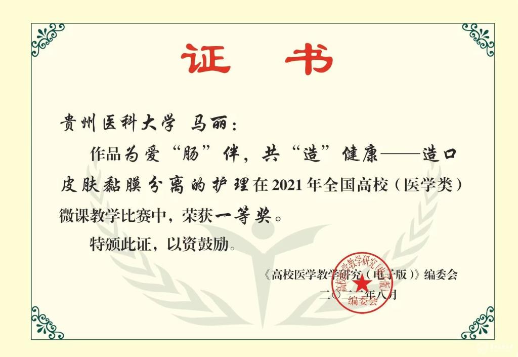 护理学院马丽老师团队的《为爱“肠”伴,共“造”健康——造口皮肤黏膜分离的护理》微课作品,荣获一等奖;麻醉学院王丰老师团队的《院内心肺脑复苏》微课作品,临床学院吴玉婷老师团队的《切莫谈“瘤”色变——肿瘤的命名与分类》微课作品,荣获二等奖;基础医学院韩晶老师团队的《毛细血管》,杨喆老师团队的《骨单位》微课作品获鼓励奖。
