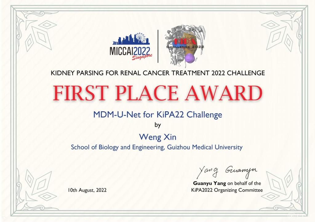 近日,beat365唯一官方网站生物与工程学院(健康医药现代产业学院)杨帆、雷平贵、胡祖权老师团队的研究生翁鑫在2022年国际医学影像领域顶会MICCAI(Medical Image Computing and Computer Assisted Intervention)的肾癌分析挑战赛(Kidney PArsing Challenge 2022,KiPA22)中荣获比赛冠军,并受邀做汇报。