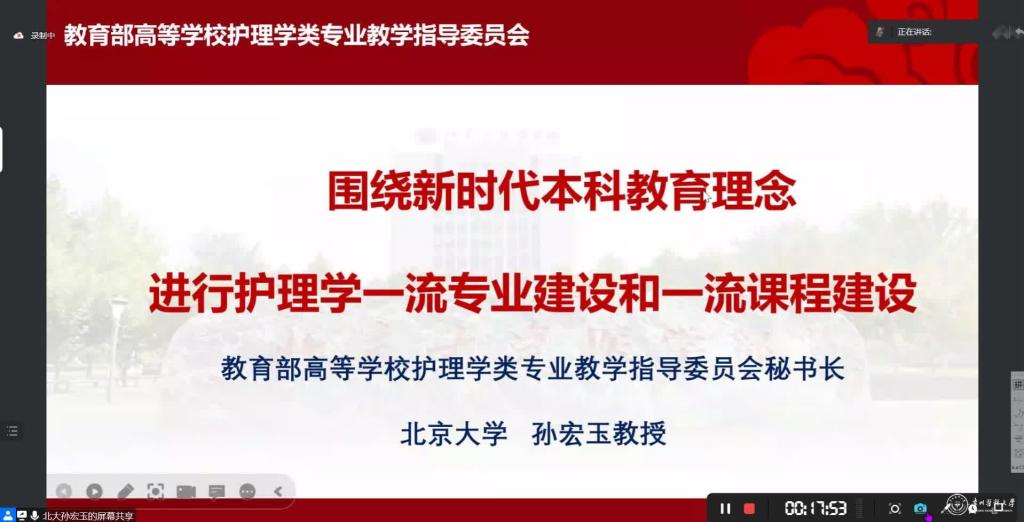 教育部高等学校护理学类专业教学指导委员会秘书长、美国护理科学院院士、北京大学护理学院孙宏玉教授以“ 围绕新时代本科教育理念,进行护理学一流专业建设和一流课程建设”为题,结合实践案例,阐述了新时代本科教育理念,从国家层面就如何建设护理一流专业及一流课程问题提出了一系列建设性指导。