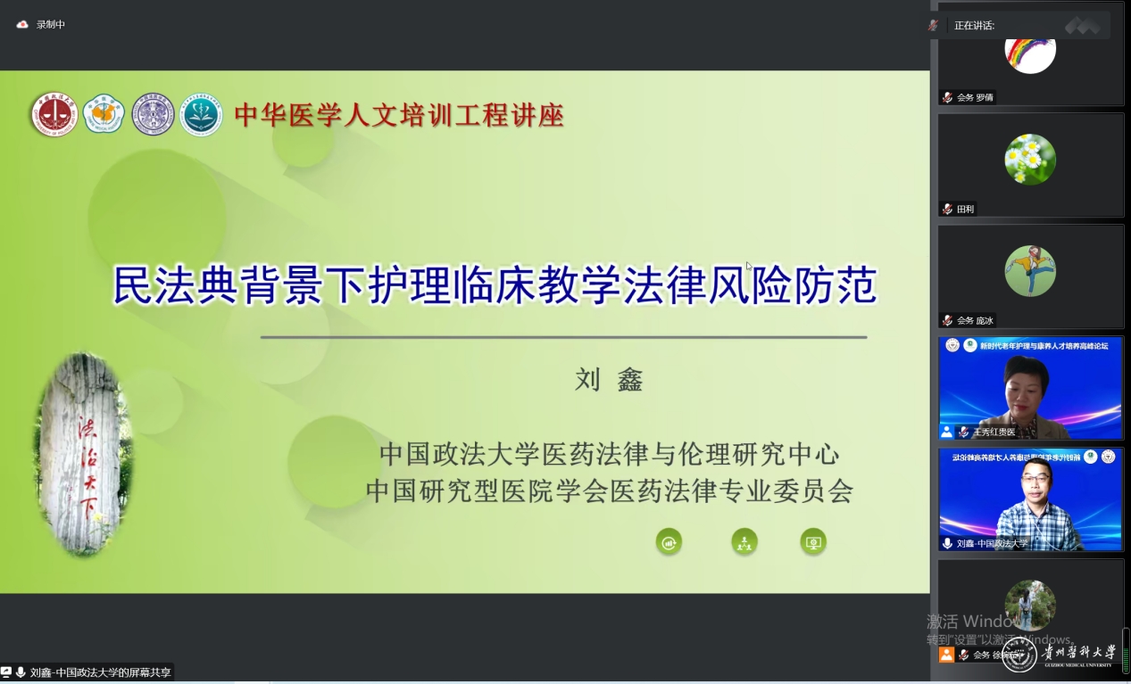 中国政法大学医药法律与伦理研究中心刘鑫教授以“民法典背景下护理临床教学法律风险防范”为题,结合众多临床案例,介绍了护理临床教学中存在的一系列法律问题,阐述了《民法典》与护理临床教学有关的内容,提出了护理临床教学风险防范建议,为预防临床教学风险提供了重要参考。