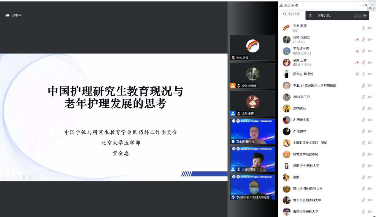 全国医学专业学位研究生教育指导委员会秘书处办公室主任贾金忠副研究员以“中国护理研究生教育现况与老年护理人才培养的思考”为题,以科学详实的数据剖析了中国护理研究生教育现况,指出了目前老年护理人才培养存在的问题,为促进“护教协同”提供了重要参考。