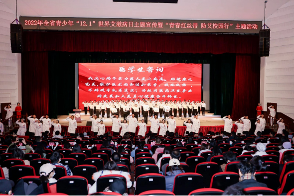 12月1日,2022年全省青少年“12.1”世界艾滋病日主题宣传暨“青春红丝带 防艾校园行”主题活动在beat365南校区大礼堂举行。共青团贵州省委副书记李剑,学校党委副书记刘文,副校长曾柱,贵州省卫生健康委员会疾病预防控制处处长胡洲,共青团贵州省委维护青少年权益部部长李玲,学校党委委员、党委宣传部(精神文明办)部长(主任)、党委统战部部长陈颖出席活动。各职能部门负责人、各学院团委负责人、各学院师生代表参加。活动由贵州省卫生健康委员会、共青团贵州省委、beat365唯一官方网站、贵州省学生联合会联合主办,beat365唯一官方网站团委、贵州青少年融媒体有限责任公司协办。