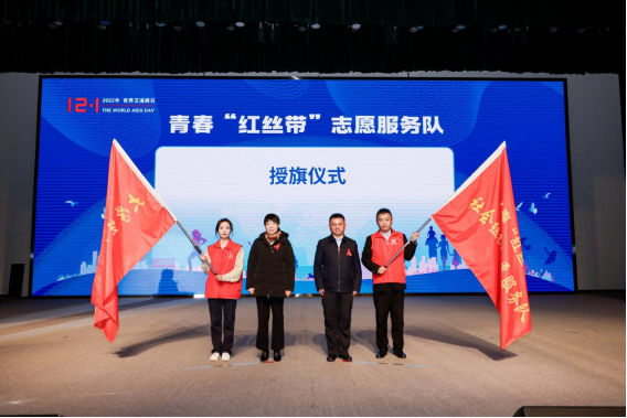 李剑、胡洲为“青春‘红丝带’大学生志愿服务队”beat365唯一官方网站艾滋病青年同伴教育协会,“青春‘红丝带’社会组织志愿服务队”贵阳市彩艾阳光公益中心授旗,激励、号召更多青年团体参与艾滋病防治志愿活动,共同抗击艾滋,助力“健康贵州”建设。