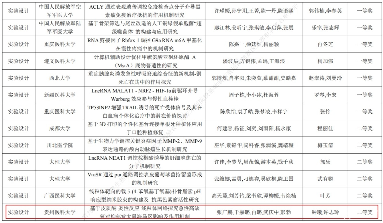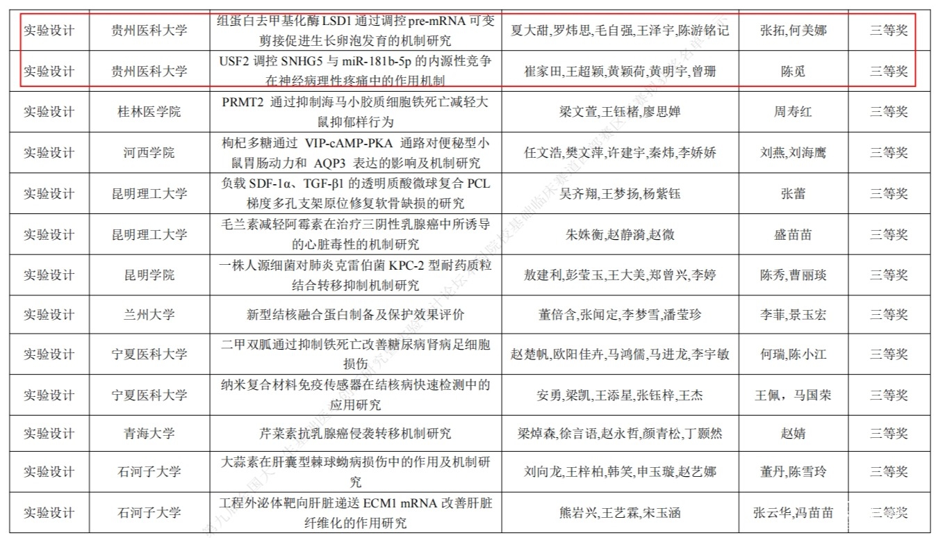 近日,由高等学校国家级实验教学示范中心联席会基础医学组主办、宁夏医科大学承办的第九届全国大学生基础医学创新研究暨实验设计论坛本科院校基础临床赛道西部赛区选拔赛在宁夏医科大学圆满结束。beat365教师、学生积极参与,赛前参赛团队和指导老师对参赛作品不断打磨与演练,赛中参赛团队表现优异,选送参赛的6项作品全部获奖。其中,家蝇抗菌肽AMP-17对铜绿假单胞菌的抗菌活性及机制研究(团队成员:苏庭,蔡汝侠,高永飞,黄方燕,付玲玲;指导教师:国果)和基于HMGCR及PPARα信号通路探究雪莲果浸膏对高脂血症大鼠脂质代谢的影响(团队成员:龚顺航,张金涛,杨杰,吴兴林,江山;指导教师:孙见飞,吴遵秋)荣获创新研究组别二等奖;基于皮质酮-炎性反应-线粒体网络探究急性高缺氧对抑郁症大鼠海马区影响及作用机制(团队成员:张广鹏,于嘉璐,冉璐,武庆中,彭勃;指导教师:钟曦,许志玲)荣获实验设计组别二等奖;组蛋白去甲基化酶LSD1通过调控pre-mRNA可变剪接促进生长卵泡发育的机制研究(团队成员:夏大甜,罗炜思,毛自强,王泽宇,陈游铭记;指导教师:张拓,何美娜)、USF2调控SNHG5与miR-181b-5p的内源性竞争在神经病理性疼痛中的作用机制(团队成员:崔家田,王超颖,黄颖荷,黄明宇,曾珊;指导教师:陈觅)和苗药“石吊兰”通过ROSNLRP3通路对COPD大鼠肺部炎性损伤的机制研究(团队成员:何建方,林文婷,杨向前,胡子怡,左艾榛;指导教师:肖鑫,曾佳)荣获实验设计组别三等奖。