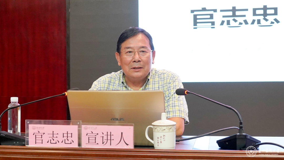 官志忠以《千里之行,始于足下——浅谈医学成才之路》为题,围绕理想、奋斗、机遇、收获四个方面,分享了自己在青少年时期的求学经历、在壮年时期的人生理想和奋斗故事。他勉励同学们千里之行始于足下,踏实做事积淀发展,坚定信念实现理想,为共铸中国梦贵医梦努力奋斗。
