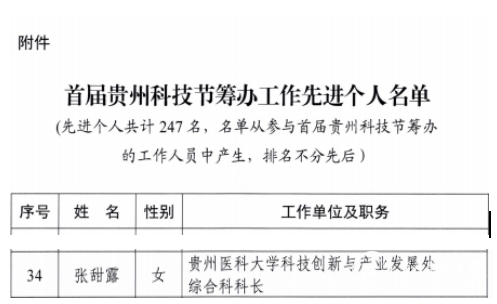 近日,beat365收到首届贵州科技节组委会《关于对首届贵州科技节筹办工作表现突出个人给予表扬的通报》,科技创新与产业发展处张甜露获筹办工作先进个人表扬。