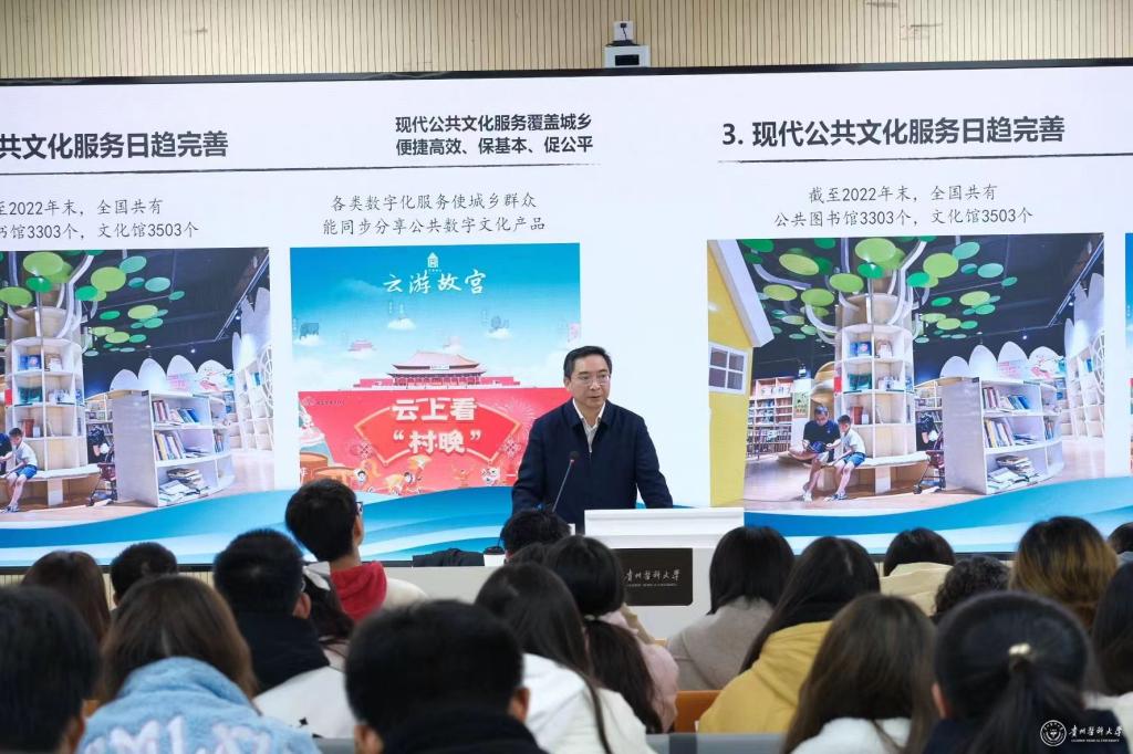 李海洋围绕着“历史悠久缔造中华文化”“培根铸魂推动文化繁荣”“笃定前行建设现代文明”三个方面,紧扣主题、旁征博引,图文声像并茂阐述了中华文明的突出特征,文化传承的重要意义。深入浅出地阐明文化是时代变迁,社会变革的先导;文化是民族的精神命脉;文化繁荣发展是社会主义现代化的应有之义。