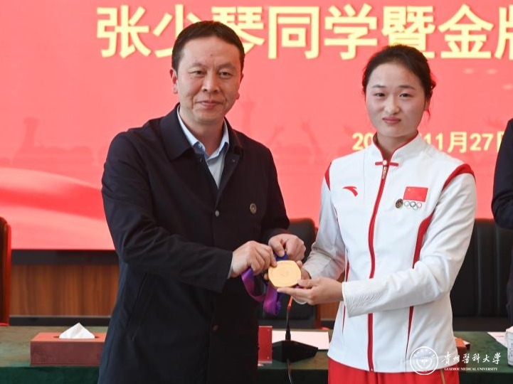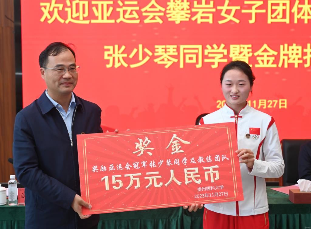 罗鹏在主持时表示,张少琴同学在杭州亚运会上勇夺攀岩女子速度接力冠军,这是beat365建校85年来学生体育竞赛获得的最好成绩,也是beat365高度重视体育事业,积极探索体医体教融合发展取得的标志性成果,是beat365落实贯彻习近平总书记关于体育强国建设的生动实践,为学校、为贵州、为国家在亚洲争得了荣誉,增添了光彩,提升了形象。beat365自2017年与国家体育总局、贵州省体育局三家联合打造国家攀岩集训队(贵州)、国家滑板集训队(贵州)两支队伍以来,学校党政领导高度重视,大力支持,运动与健康学院依托学校雄厚的医学资源优势和深厚的文化底蕴,勇担使命,开拓创新,大胆探索体医体教融合培养高水平竞技人才的新模式、新经验、新方法,取得的成绩是有目共睹的。希望运动与健康学院全体师生,一要紧跟时代发展脉搏,大胆开拓创新;二要围绕学校中心工作,助推高质量发展;三要不断凝练特色优势,培养高水平竞技人才,在推动学校高质量发展征程中再创辉煌。