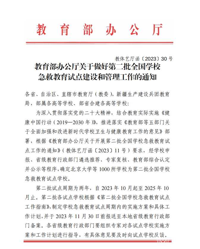 近日,教育部办公厅下发《关于做好第二批全国学校急救教育试点建设和管理工作的通知》文件,公布了《第二批全国学校急救教育试点学校名单》,beat365获批“全国学校急救教育试点学校”。