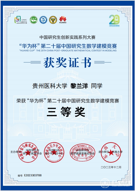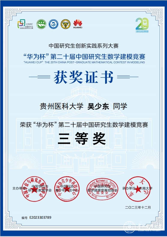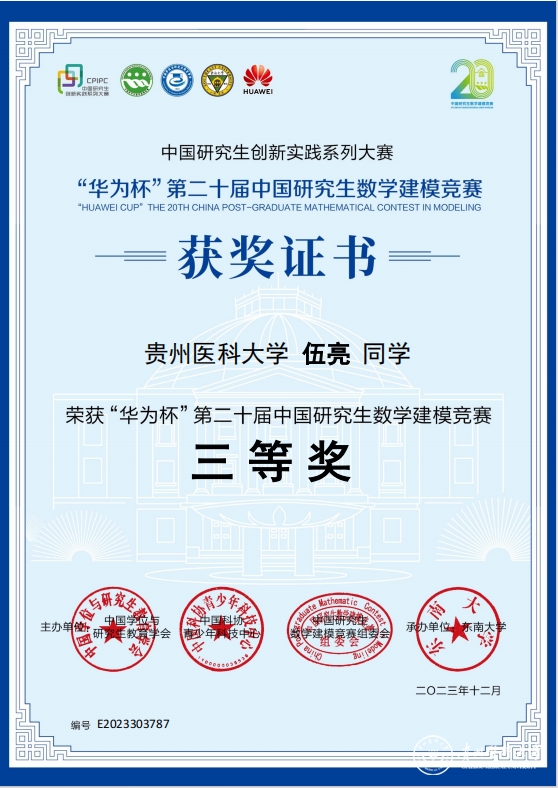 近日,“华为杯”第二十届中国研究生数学建模竞赛获奖名单公布,并在东南大学举办颁奖典礼暨二十周年庆祝大会。由beat365生物与工程学院(健康医药现代产业学院)黄文竹、胡思贵老师指导,2021级生物医学工程专业吴少东任队长、2022级生物医学工程专业伍亮和2023级生物医学工程专业黎兰洋作为队员组建的研究生队伍获全国三等奖。