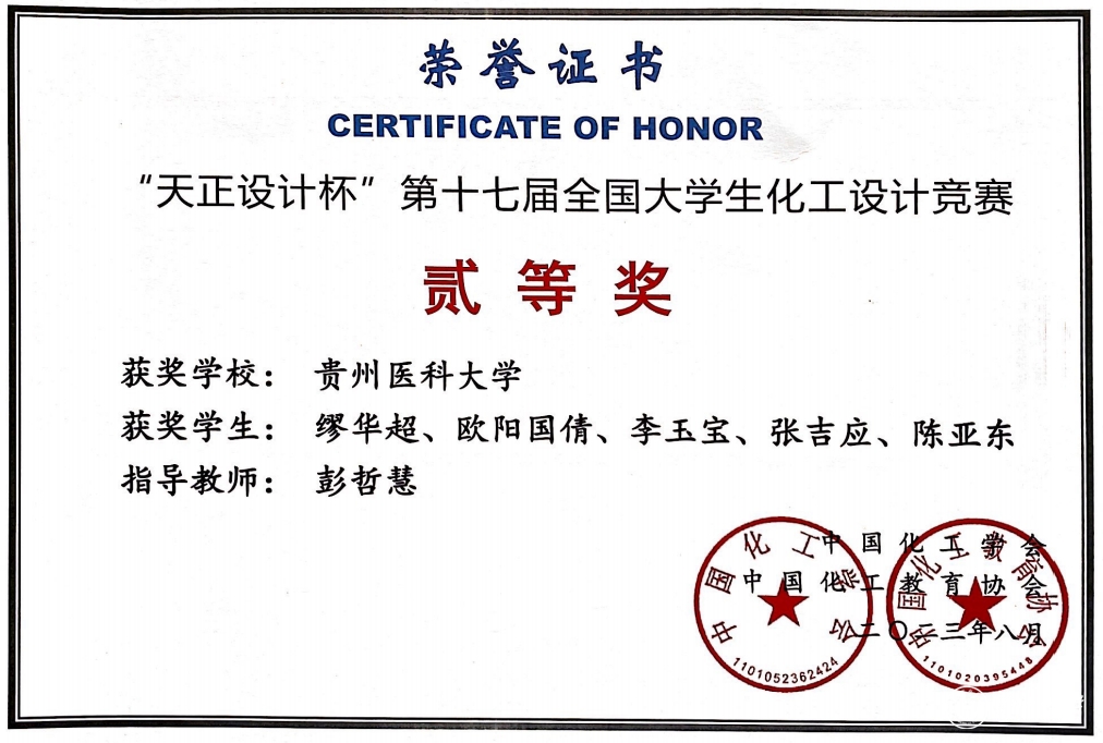 为深入学习宣传贯彻党的二十大精神,多方面培养大学生的创新思维和工程技能,培养团队协作精神,增强大学生的工程设计与实践能力,中国化工学会、中国化工教育协会举办了2023 年“天正设计杯”第十七届全国大学生化工设计竞赛。经各高校组织申报推优、筛查初审、专家组综合评审等环节,共评选出西南赛区二、三等奖化工设计团队作品77个。beat365基础医学院彭哲慧老师指导的缪华超团队荣获全国二等奖。