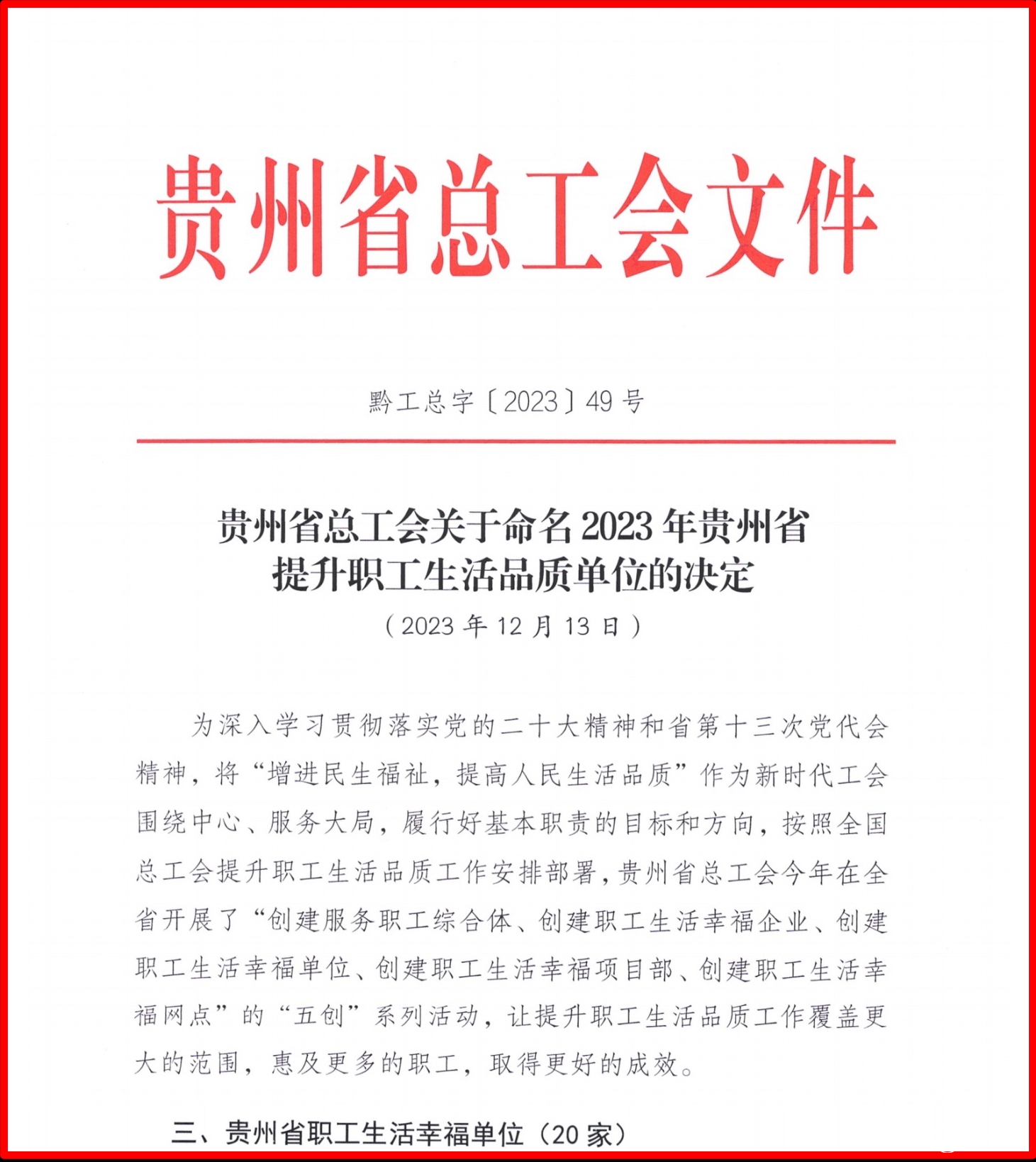 近日,贵州省总工会下文命名一批在2023年度“创建服务职工综合体、创建职工生活幸福企业、创建职工生活幸福单位、创建职工生活幸福项目部、创建职工生活幸福网点”的“五创”系列活动中,勇于创新、工作突出、效果显著的单位为“提升职工生活品质单位”。附属口腔医院由省教育工会组织推荐,在此次评选中荣获“贵州省职工生活幸福单位”称号。