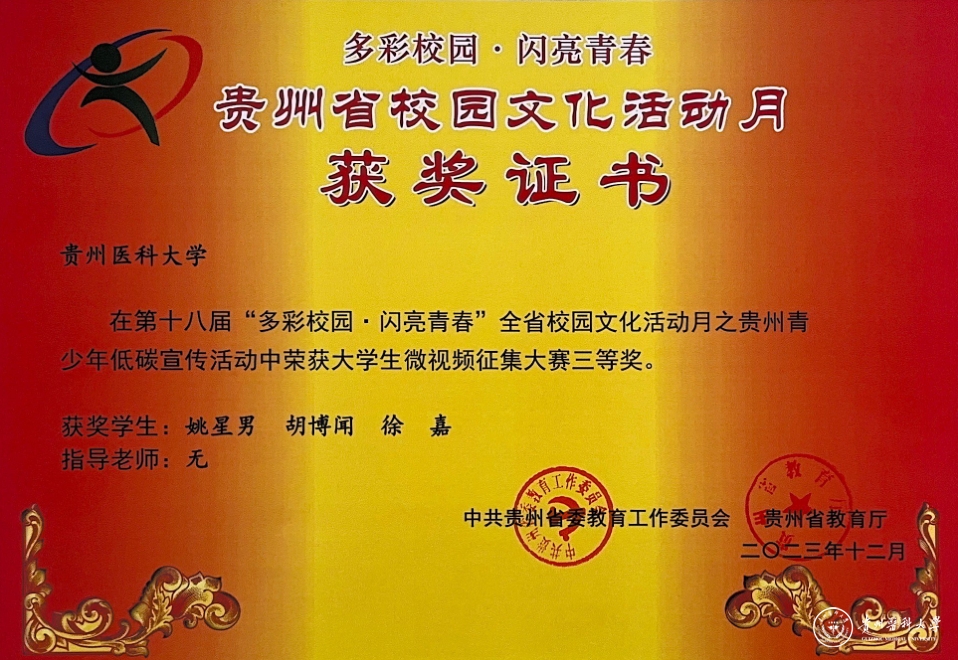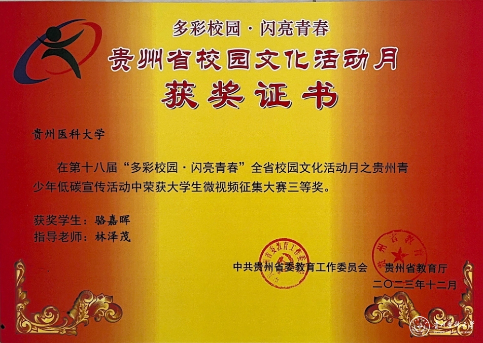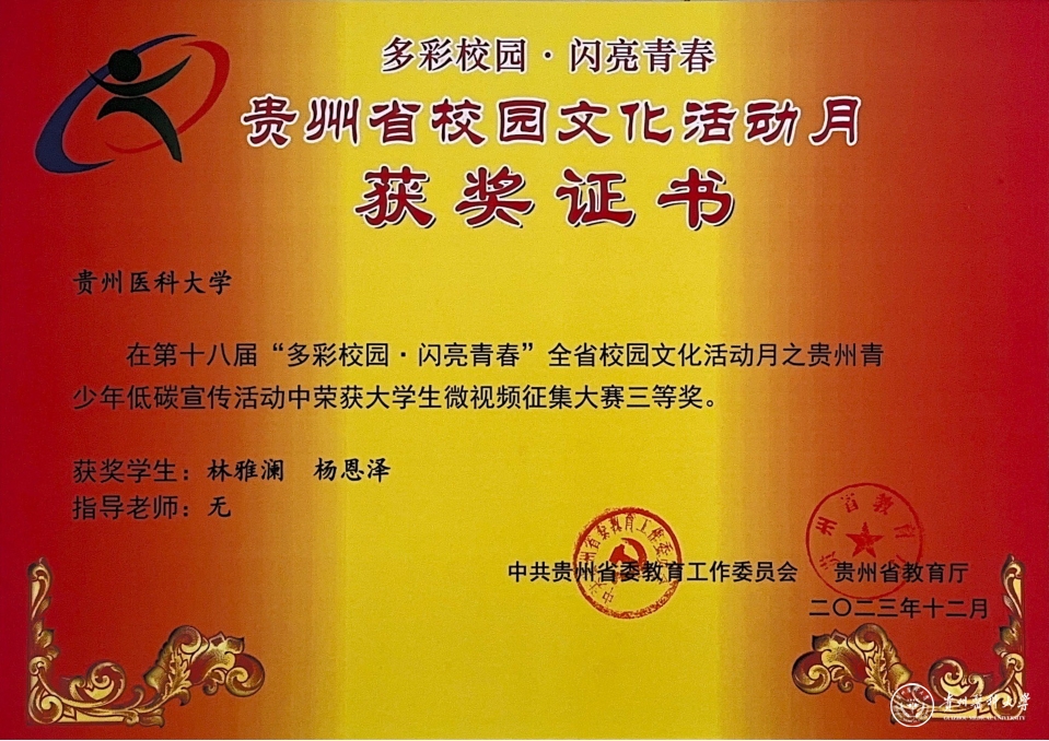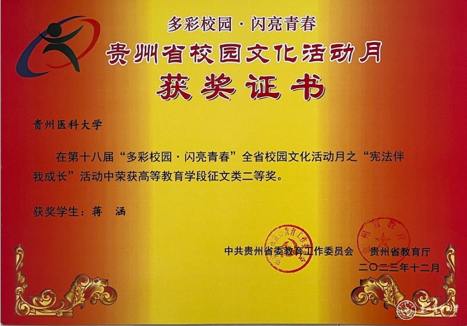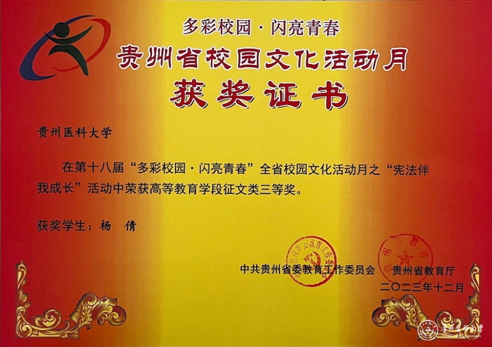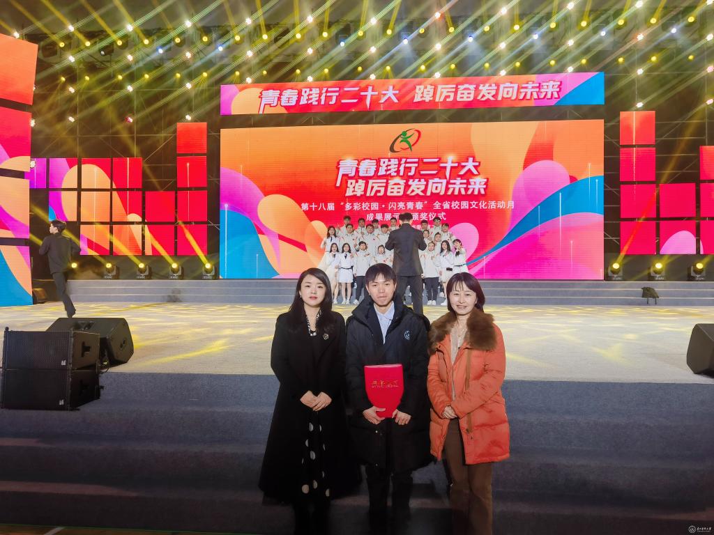 12月20日,省委教育工委、省教育厅、省精神文明办、省委网信办、省文化和旅游厅、团省委联合主办的第十八届“多彩校园·闪亮青春”全省校园文化活动月成果展示暨颁奖仪式在贵州师范学院召开,校党委委员、党委宣传部(精神文明办)部长(主任)、党委统战部部长陈颖,校团委书记王妤煜参会,马克思主义学院2022级学生杨加刘作为代表上台领奖。