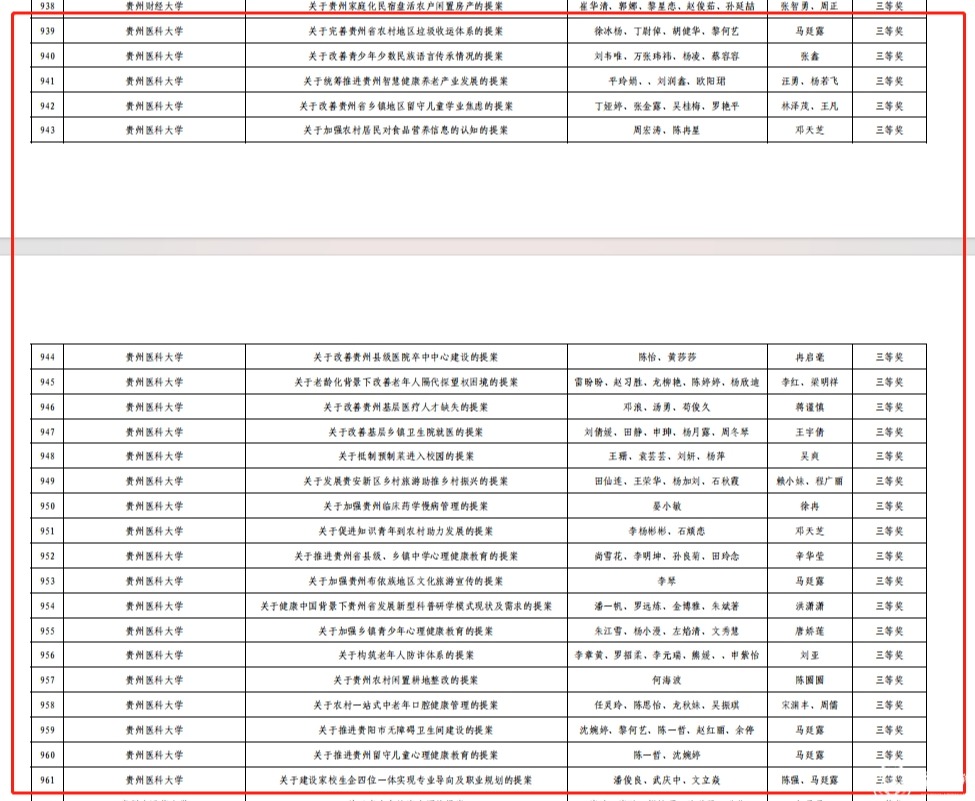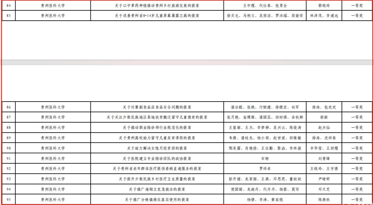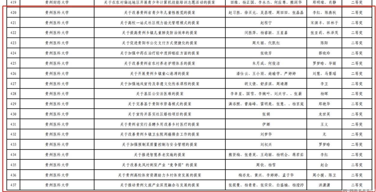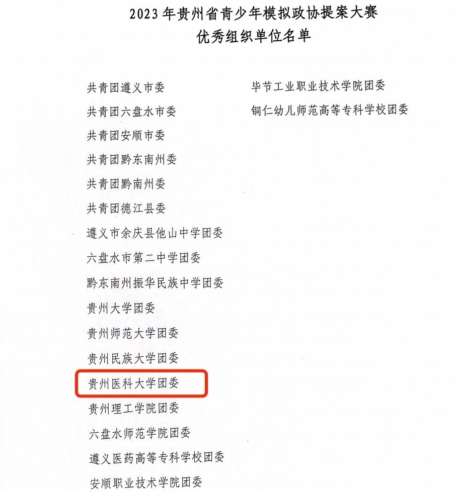 近日,团省委、贵州省政协提案委、省学联联合下发了《关于公布2023年贵州省青少年模拟政协提案大赛评选结果的通报》,“beat365唯一官方网站团委”被评为“优秀组织单位”,药学院“关于以中草药种植推动贵州乡村旅游发展的提案”等12个作品被评为“一等奖”,麻醉学院“关于改善贵州省青少年儿童性教荒的提案”等18个作品被评为“二等奖”,基础医学院“关于完善贵州省农村地区垃圾收运体系的提案”等23个作品被评为“三等奖”。