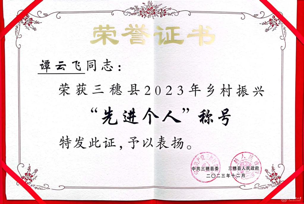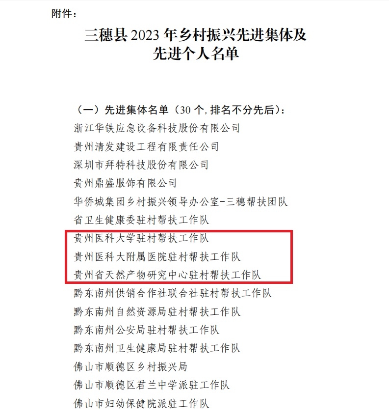 近日,三穗县委县政府表彰了在巩固拓展脱贫攻坚成果同乡村振兴有效衔接各项工作中爱岗敬业、锐意创新、勇于担当、无私奉献的先进集体和先进个人。“beat365唯一官方网站驻村帮扶工作队、贵州医科大附属医院驻村帮扶工作队、贵州省天然产物研究中心驻村帮扶工作队”获先进集体称号,贵州省天然产物研究中心谭云飞荣获先进个人称号。