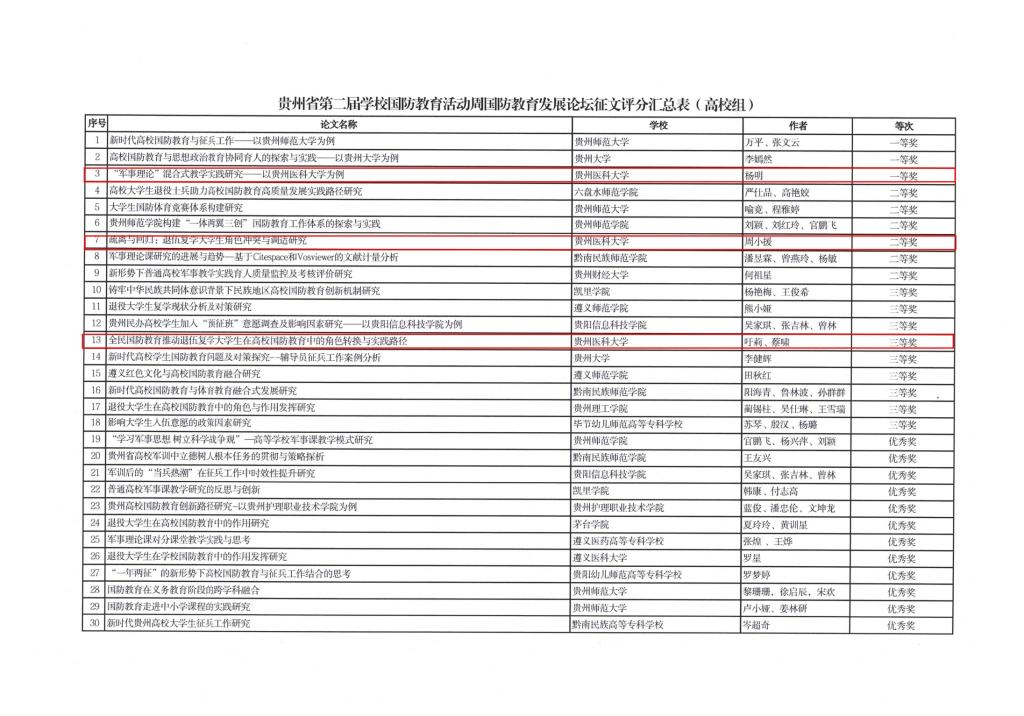 近日,省教育厅公布了贵州省第二届学校国防教育活动周论文获奖名单,beat365教师杨明的论文《“军事理论”混合式教学实践研究——以beat365唯一官方网站为例》获一等奖,周小媛的论文《疏离与回归:退伍复学大学生角色冲突与调适研究》获二等奖,吁莉、蔡啸的论文《全民国防教育推动退伍复学大学生在高校国防教育中的角色转换与实践路径》获三等奖。