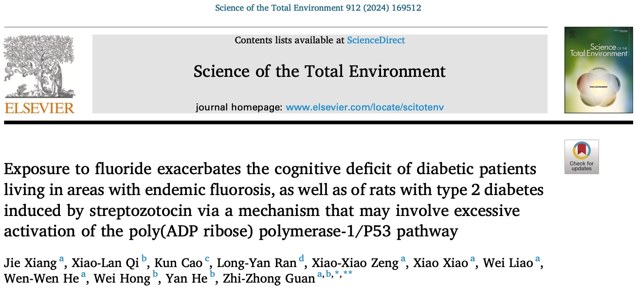 近期,beat365官志忠教授研究团队在地方性氟中毒研究领域取得重要进展,研究论文“氟暴露加重地方性氟中毒地区糖尿病患者及链脲佐菌素诱导的2型糖尿病大鼠认知功能缺陷,其机制可能与聚(ADP核糖)聚合酶-1/P53通路过度激活有关”发表于国际环境科学知名杂志《Science of the Total Environment》(中科院一区、Top期刊、影响因子:9.8):Xiang J, Qi XL, Cao K, Ran LY, Zeng XX, Xiao X, Liao W, He WW, Hong W, He Y, Guan ZZ. Exposure to fluoride exacerbates the cognitive deficit of diabetic patients living in areas with endemic fluorosis, as well as of rats with type 2 diabetes induced by streptozotocin via a mechanism that may involve excessive activation of the poly(ADP ribose) polymerase-1/P53 pathway. Science of the Total Environment. 2024;912:169512. doi: 10.1016/j.scitotenv.2023.169512。