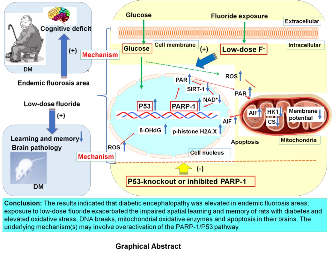 该研究结果显示,地方性氟中毒病区糖尿病患者认知功能障碍发生率明显高于非氟病区糖尿病患者。进一步的动物实验研究发现,糖尿病大鼠空腹血糖、胰岛素抵抗和血脑屏障通透性升高,空间学习记忆和脑组织神经元尼氏体数下降;在这些动物中,脑组织P53和PARP-1的表达和活性以及NAD+、PAR、ROS、8-OHdG、磷酸化组蛋白H2A的水平、AIF和凋亡含量等均升高;线粒体HK1、CS活性和膜电位降低。经葡萄糖处理的神经细胞表现出与糖尿病大鼠类同的生物化学及分子生物学变化。明显的是,氟暴露(甚至是不引起机体明显病理改变的小剂量氟)加重了糖尿病大鼠或高糖处理神经细胞的这些改变。机制性研究显示,PARP-1抑制或p53敲除减轻了氟暴露对高糖处理导致的这些异常改变。表明,氟暴露(尤其是小剂量氟)可引起糖尿病脑病的发生率增高,其发生机制可能与PARP-1/P53通路的过度激活有关。该研究首次在国际上表明了氟暴露对糖尿病脑病进展的影响,并揭示了氟诱导或加重糖尿病认知功能障碍的可能性发生机制。另外,该研究结果提供了当前氟暴露流行病学新发现,提示特别要注意长期小剂量氟暴露对机体的积累性损害。