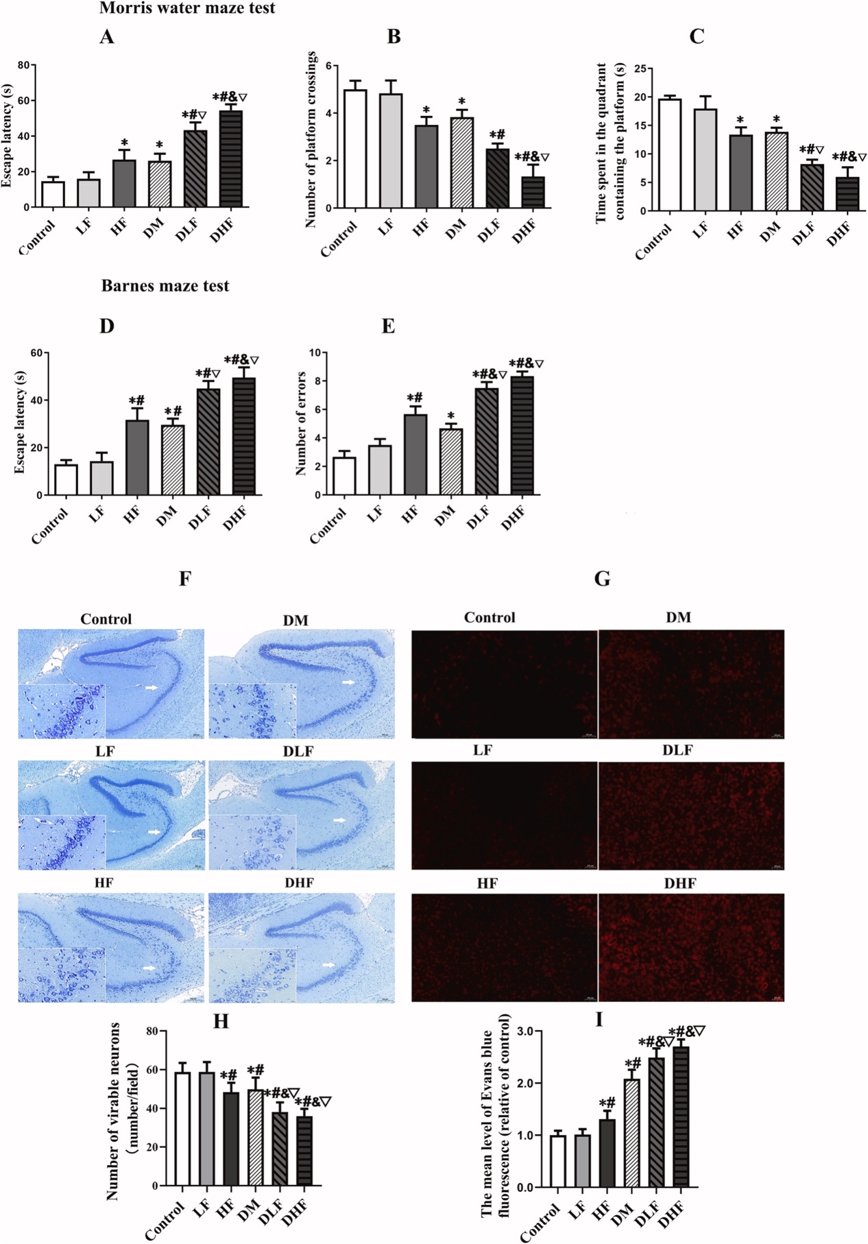 观察现象—通过水迷宫及巴恩斯实验探索普通摄氟、未摄氟糖尿病与糖尿病摄氟大鼠的空间学习记忆水平,发现单独暴露于小剂量氟化物3个月的普通SD大鼠,其学习记忆能力并无明显改变,但是该剂量氟化物明显加重了糖尿病大鼠认知功能障碍的进展。通过尼氏染色及伊文思兰循环实验发现这些摄同剂量氟化物的糖尿病大鼠存在更严重的脑组织神经元及血脑屏障的损伤。说明糖尿病大鼠脑组织对氟化物毒性存在更高的敏感性,低剂量氟化物能加速加重糖尿病大鼠的认知功能障碍及脑损伤。