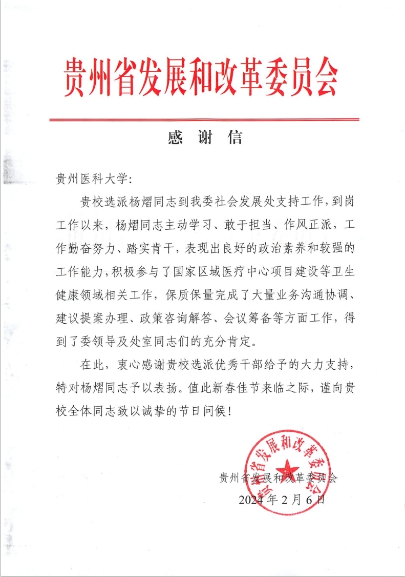 来信表示,杨熠同志到岗后表现出良好的政治素养和较强的工作能力,在国家区域医疗中心项目建设等卫生健康领域相关工作中,保质保量完成了大量工作,得到了省发展和改革委员会领导与同事的充分肯定。