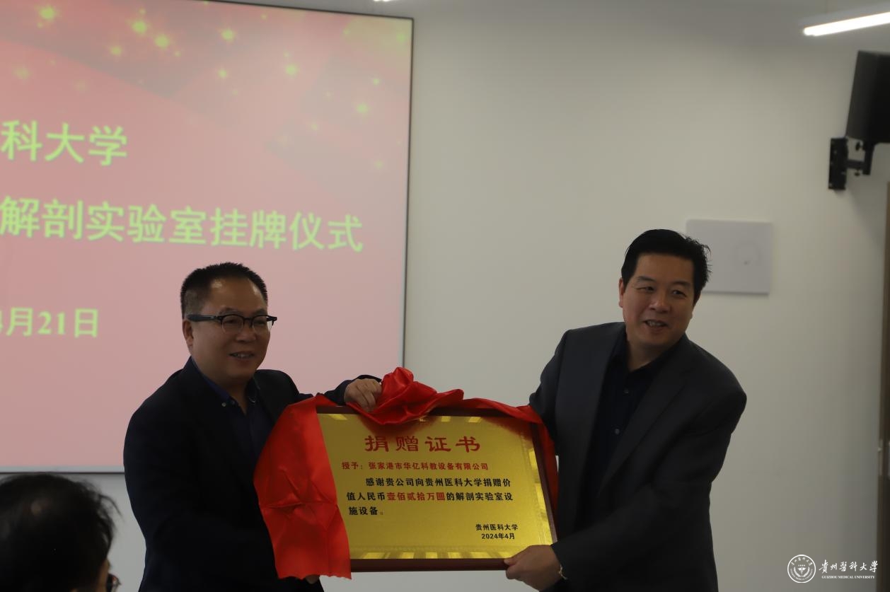 曾柱向beat365唯一官方网站标准化数智净化临床解剖实验室捐赠企业颁发牌匾。曾柱指出,人体解剖学学科要以此次挂牌为契机,进一步加强实验室建设,不断丰富教学方法与手段,持续推进解剖教学改革,提高解剖教学质量,培养高质量医学人才,为学校和学院发展做出积极贡献。