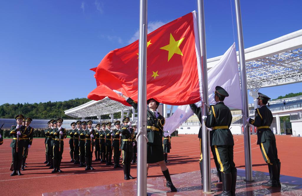 庄严的国歌声响起,2024级全体本科生及研究生代表齐唱《中华人民共和国国歌》。