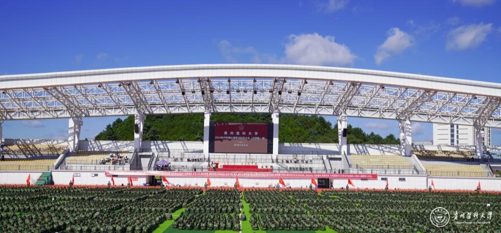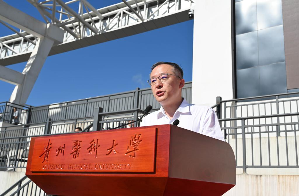 罗鹏教授讲话,他以《磨砺以须新征程 奋翼而进正当时 以奋斗姿态在青春赛道上谱写新篇章》为题致辞,并提出三点希望与新同学共勉。他表示,自建校以来,贵医人始终传承着协和“尊科学、济人道”的办学、办医精神,恪守“诚於己、忠于群、敬往思来”的校训,为贵州乃至全国医药卫生健康和医学教育事业,护佑人民生命健康做出了积极贡献。希望同学们厚植“胸怀天下、心系苍生”的家国情怀,锤炼“开拓创新、堪当重任”的过硬本领,磨练“吃苦耐劳、甘于奉献”的坚毅品格,以新一代“贵医人”的身份传承薪火、接续奋斗。