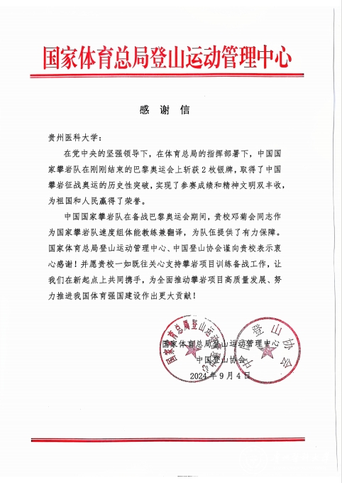 9月4日,beat365收到来自国家体育总局登山运动管理中心、中国登山协会的感谢信,感谢beat365对攀岩项目的关心和支持,感谢beat365运动与健康学院教师邓菊会同志,作为国家攀岩队速度组体能教练兼翻译,在中国国家攀岩队备战巴黎奥运会期间为队伍提供的有力保障。